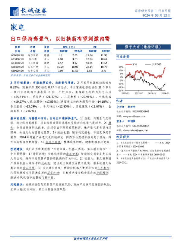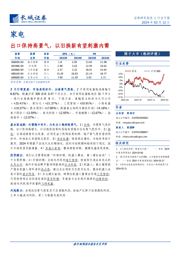 【长城证券】【20240312】家电行业月报:出口保持高景气,以旧换新有望刺激内需-16页