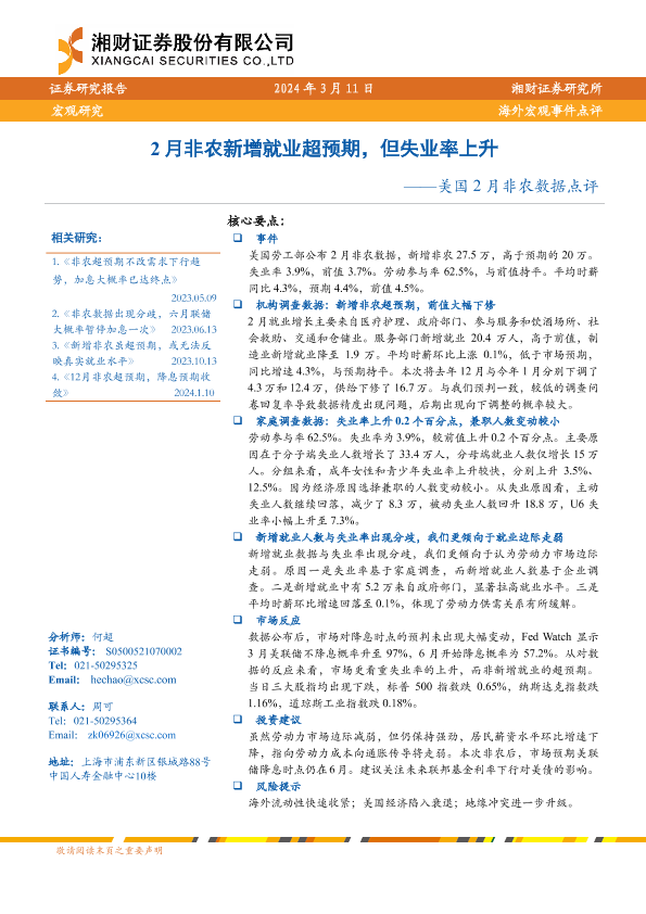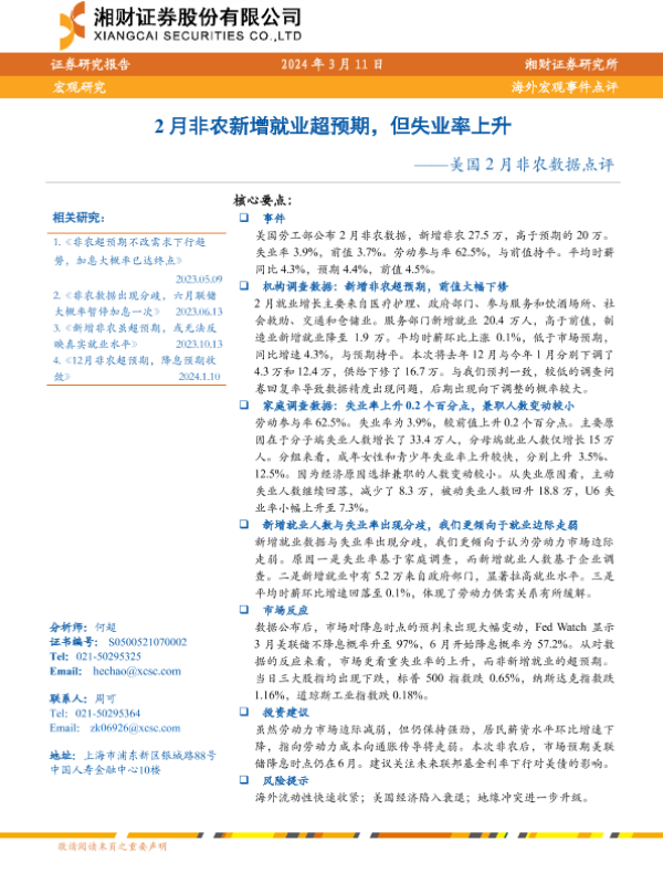 【湘财证券】【20240311】美国2月非农数据点评:2月非农新增就业超预期,但失业率上升-10页