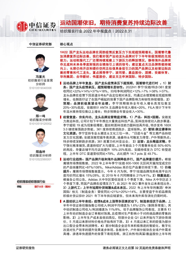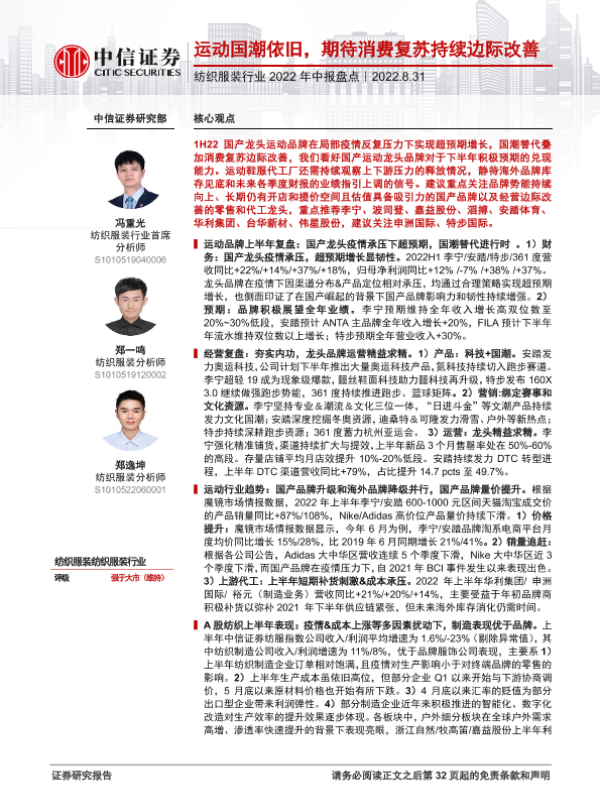 【中信证券】【20220831】纺织服装行业2022年中报盘点:运动国潮依旧,期待消费复苏持续边际改善-33页