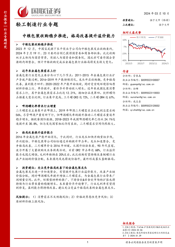 【国联证券】【20240310】轻工制造行业专题:中粮包装收购稳步推进,格局改善提升溢价能力-13页