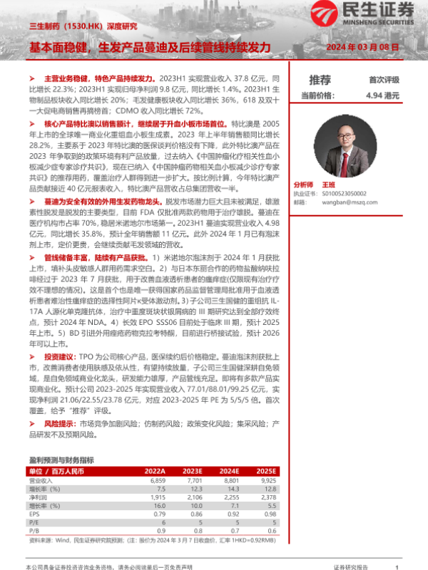 【民生证券】【20240308】三生制药(1530.HK)深度研究:基本面稳健,生发产品蔓迪及后续管线持续发力-39页