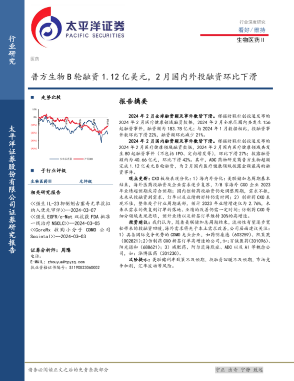 【太平洋证券】【20240309】生物医药Ⅱ行业深度研究:普方生物B轮融资1.12亿美元,2月国内外投融资环比下滑-10页