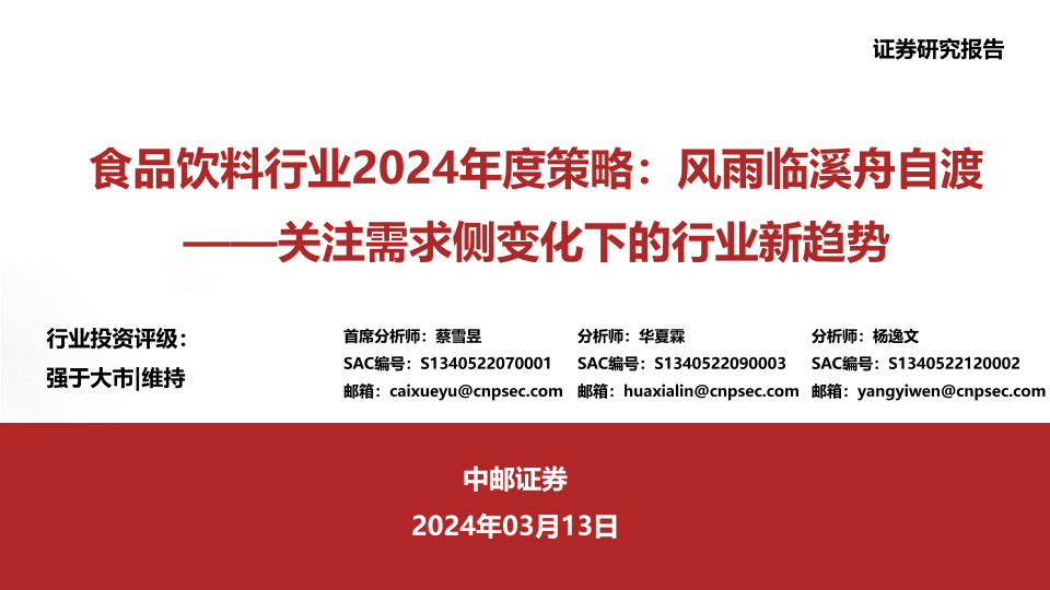 【中邮证券】【20240313】食品饮料行业2024年度策略:风雨临溪舟自渡,关注需求侧变化下的行业新趋势-40页