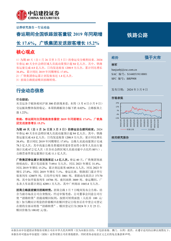 【中信建投证券】【20240309】铁路公路行业动态:春运期间全国铁路旅客量较2019年同期增长17.6%,广铁集团发送旅客增长15.2%-17页