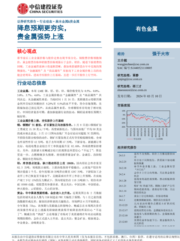 【中信建投证券】【20240310】有色金属行业:降息预期更夯实,贵金属强势上涨-14页