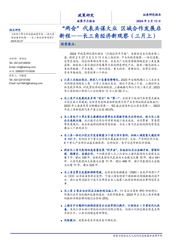 【海通证券】【20240313】长三角经济新观察(三月上):“两会”代表共谋大业,区域合作发展启新程-15页