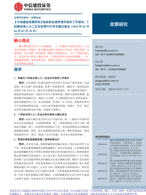 【中信建投证券】【20240312】政策研究:国务院总理李强作政府工作报告,十四届全国人大二次会议举行外交主题记者会-14页