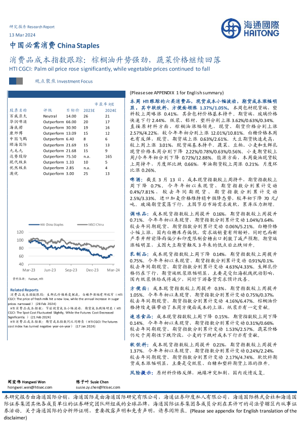 【海通国际】【20240313】中国必需消费行业消费品成本指数跟踪:棕榈油升势强劲,蔬菜价格继续回落-16页