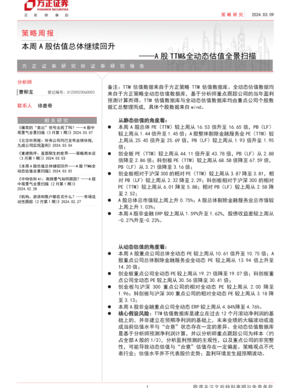 【方正证券】【20240309】A股TTM&全动态估值全景扫描:本周A股估值总体继续回升-15页