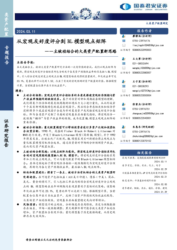 【国泰君安证券】【20240311】主被动结合的大类资产配置新思路:从宏观友好度评分到BL模型观点矩阵-35页