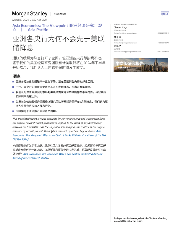 【Morgan Stanley】【20240226】亚洲各央行为何不会先于美联储降息-12页