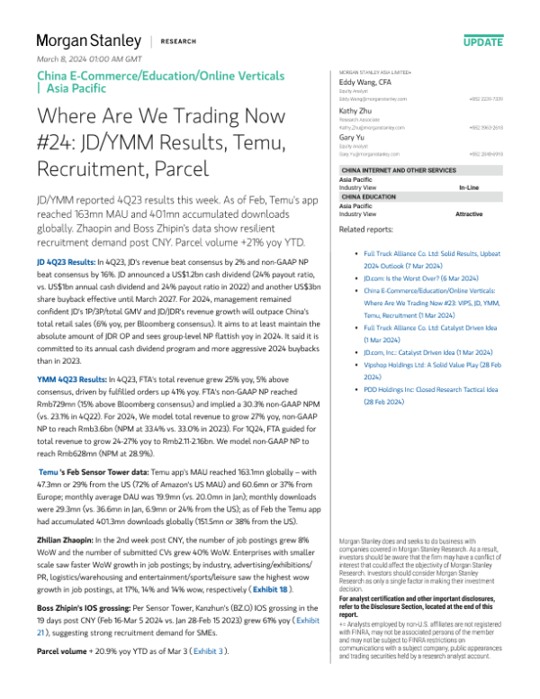 【Morgan Stanley】【202403】中国电子商务/教育/在线垂直领域:我们当前的交易状况#24:京东/满帮集团业绩、Temu、招聘、包裹-15页