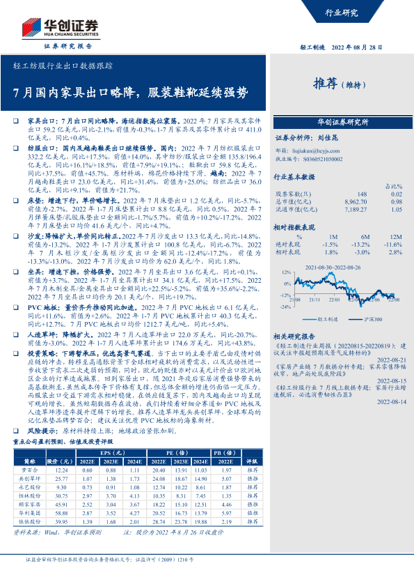 【华创证券】【20220828】轻工纺服行业出口数据跟踪:7月国内家具出口略降,服装鞋靴延续强势-19页