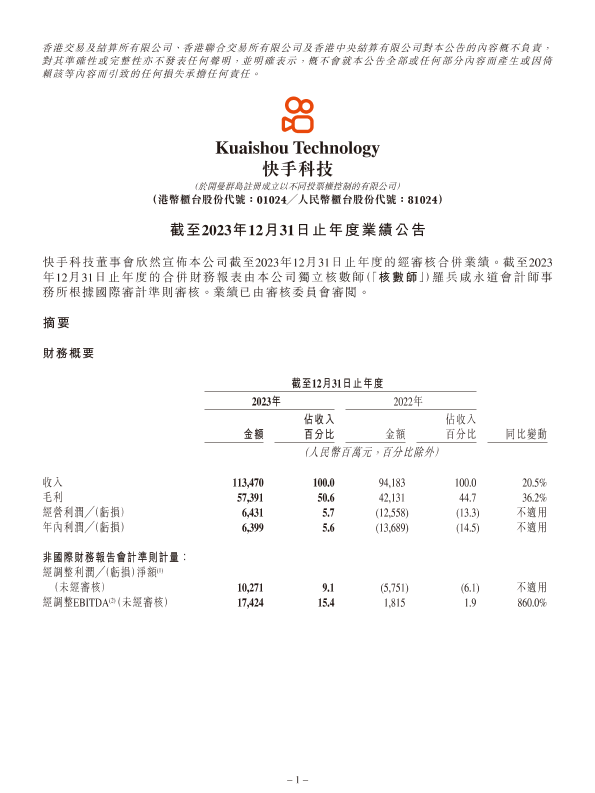 利润增长 年度业绩 快手科技 股票代码 财务报告