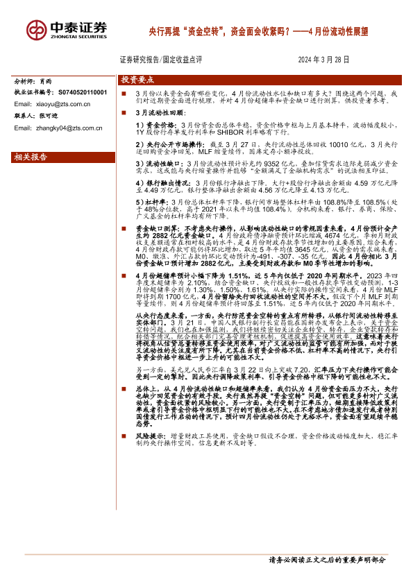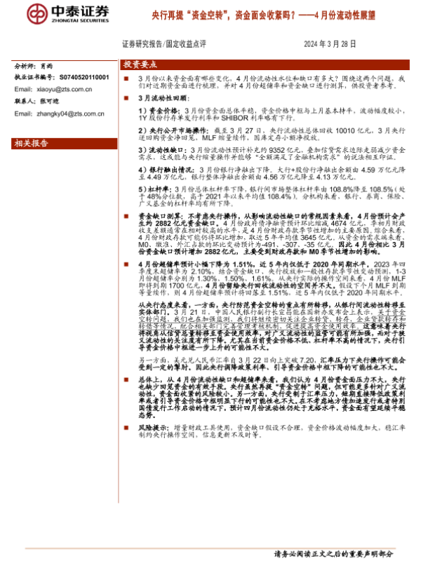 【中泰证券】【20240328】4月份流动性展望:央行再提“资金空转”,资金面会收紧吗?-13页