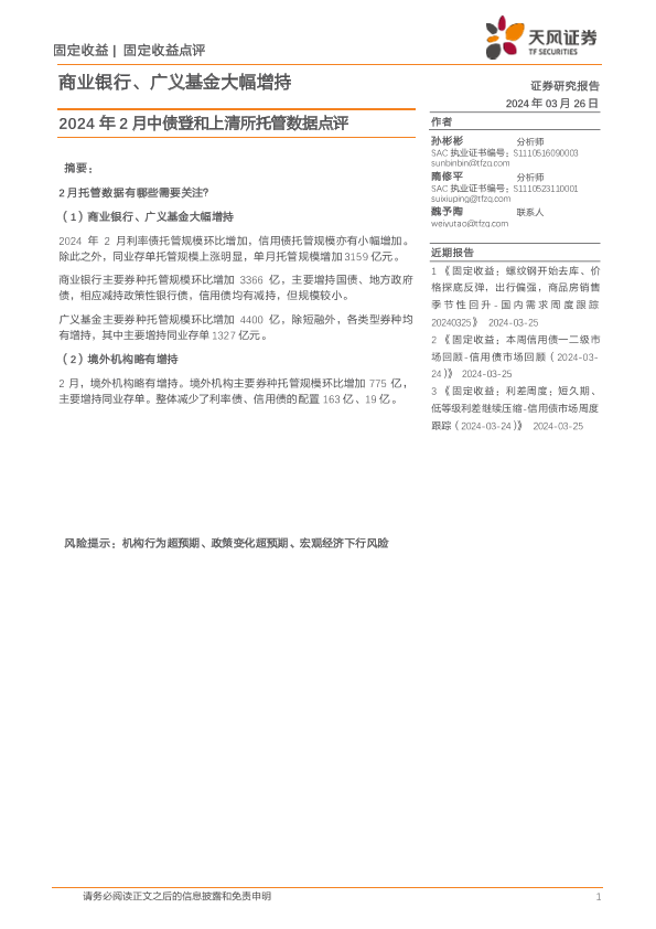 【天风证券】【20240326】2024年2月中债登和上清所托管数据点评:商业银行、广义基金大幅增持-12页