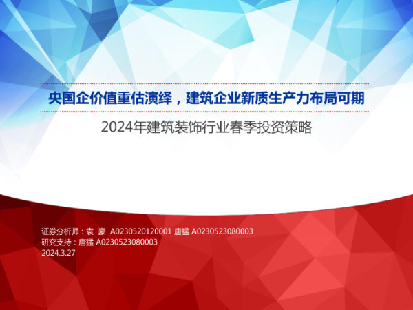 【申万宏源】【20240327】2024年建筑装饰行业春季投资策略:央国企价值重估演绎,建筑企业新质生产力布局可期-39页