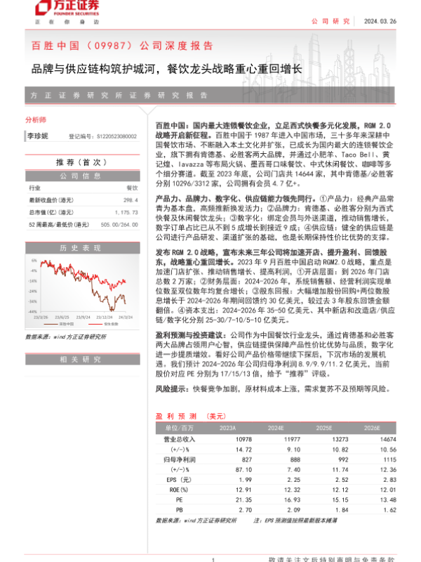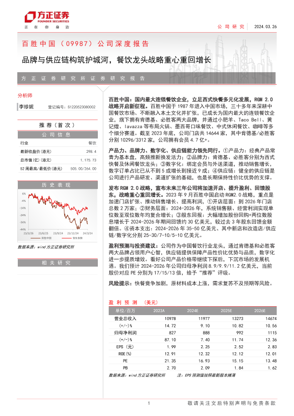 【方正证券】【20240326】百胜中国(09987.HK)公司深度报告:品牌与供应链构筑护城河,餐饮龙头战略重心重回增长-29页