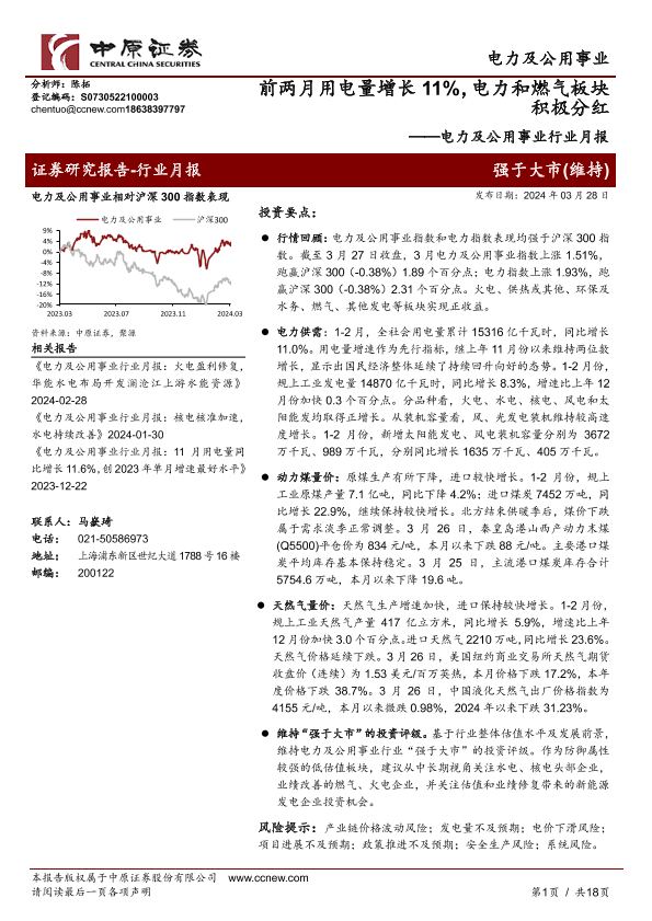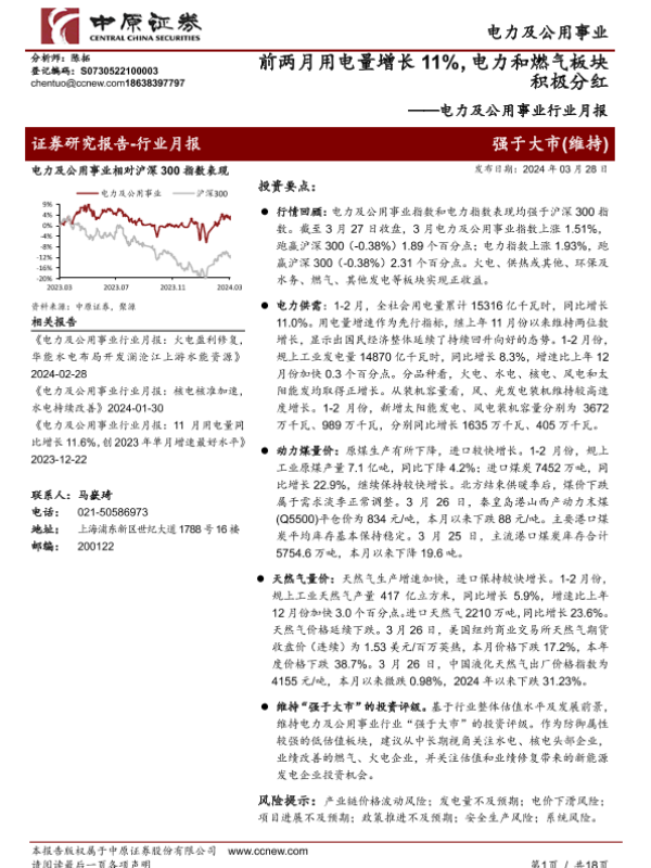 【中原证券】【20240328】电力及公用事业行业月报:前两月用电量增长11%,电力和燃气板块积极分红-18页