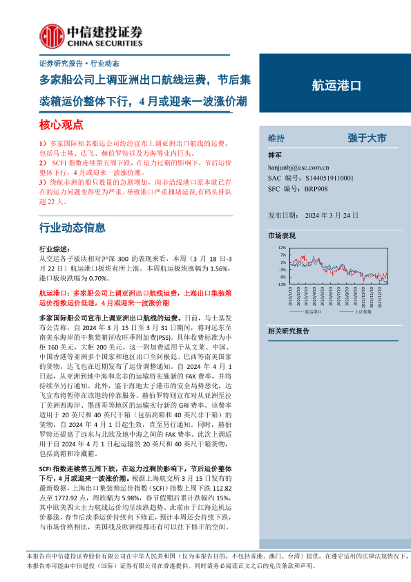 【中信建投证券】【20240324】航运港口行业:多家船公司上调亚洲出口航线运费,节后集装箱运价整体下行,4月或迎来一波涨价潮-27页