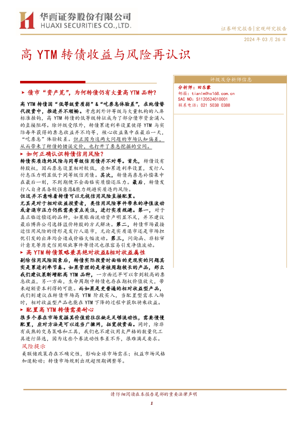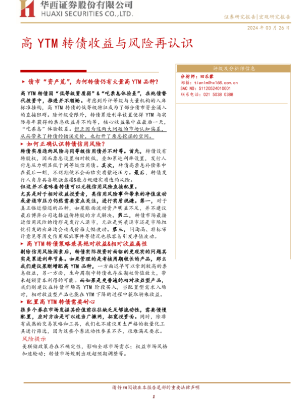 【华西证券】【20240326】宏观研究报告:高YTM转债收益与风险再认识-19页