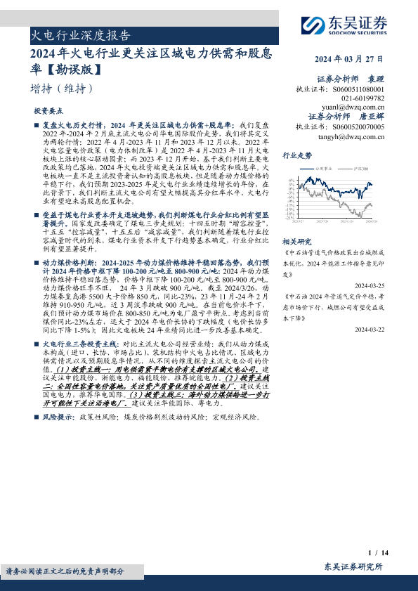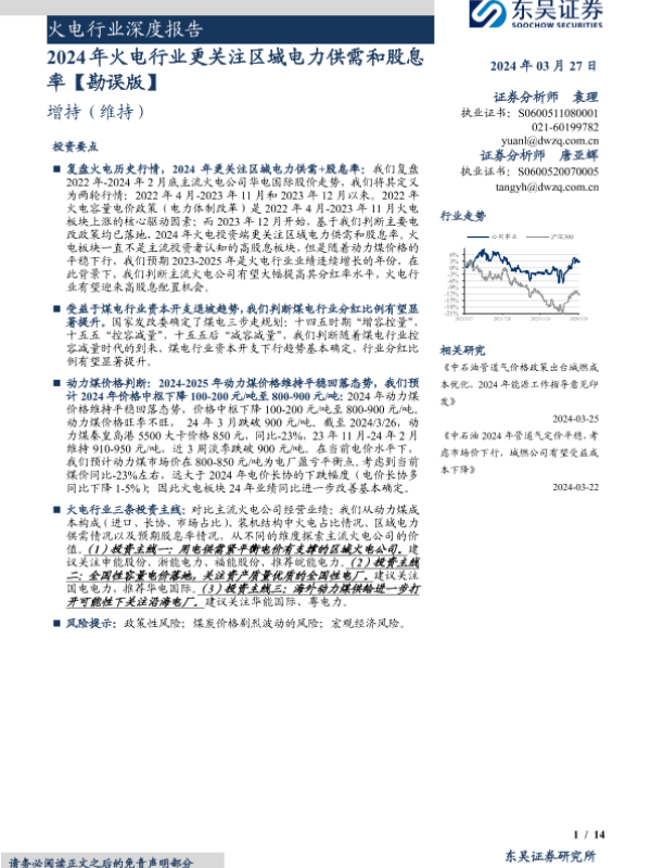 【东吴证券】【20240327】火电行业深度报告:2024年火电行业更关注区域电力供需和股息率【勘误版】-14页