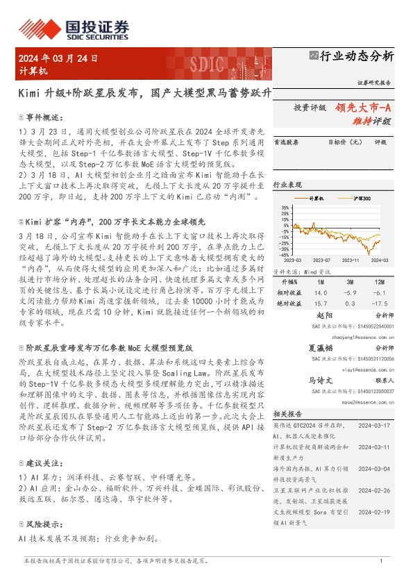 【国投证券】【20240324】计算机行业动态分析:Kimi升级+阶跃星辰发布,国产大模型黑马蓄势跃升-10页