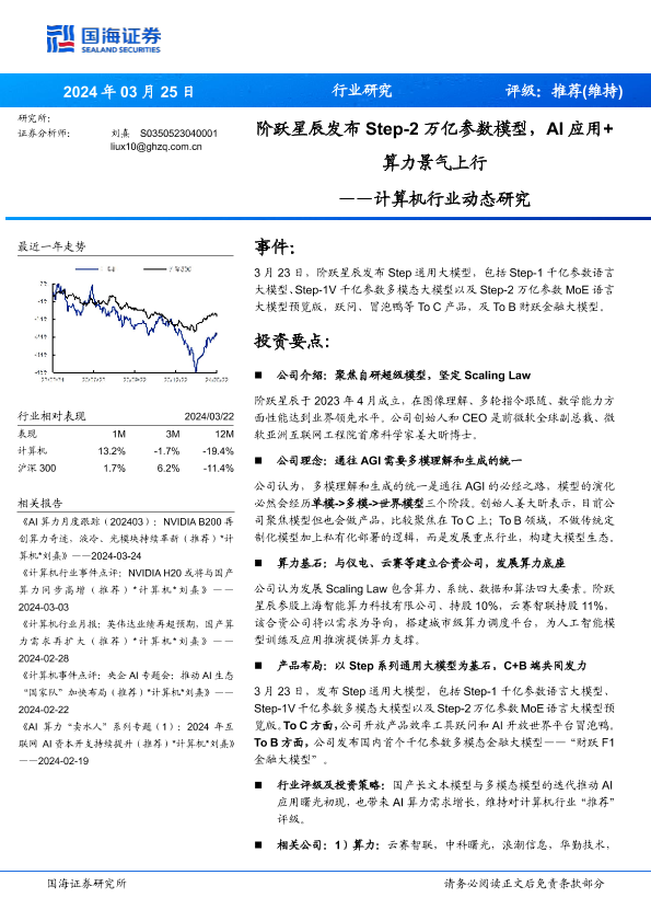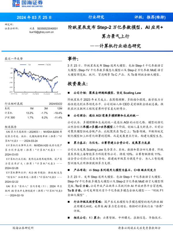【国海证券】【20240325】计算机行业动态研究:阶跃星辰发布Step-2万亿参数模型,AI应用+算力景气上行-17页