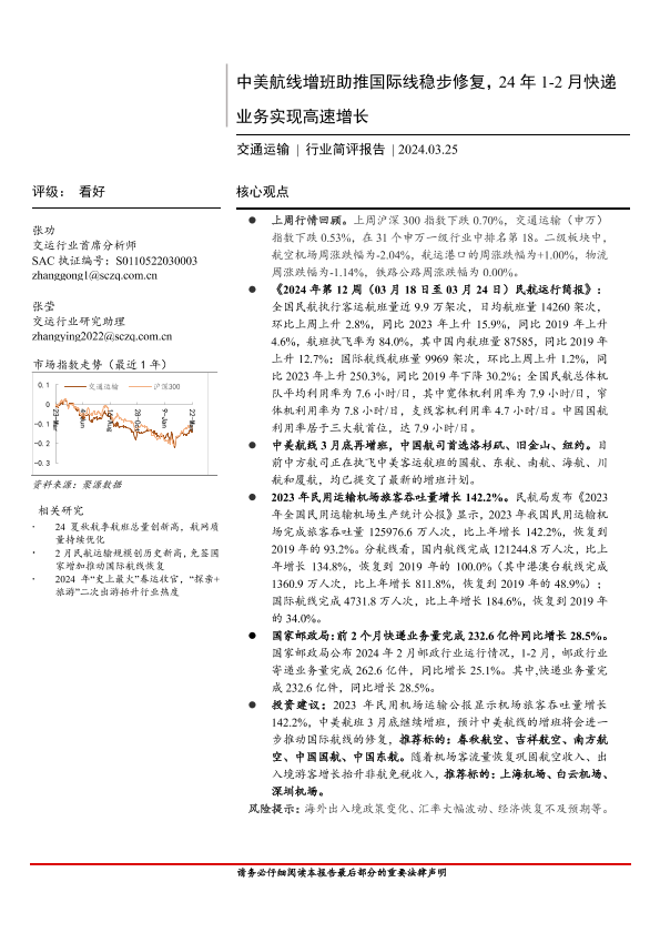 【首创证券】【20240325】交通运输行业简评报告:中美航线增班助推国际线稳步修复,24年1_2月快递业务实现高速增长-16页