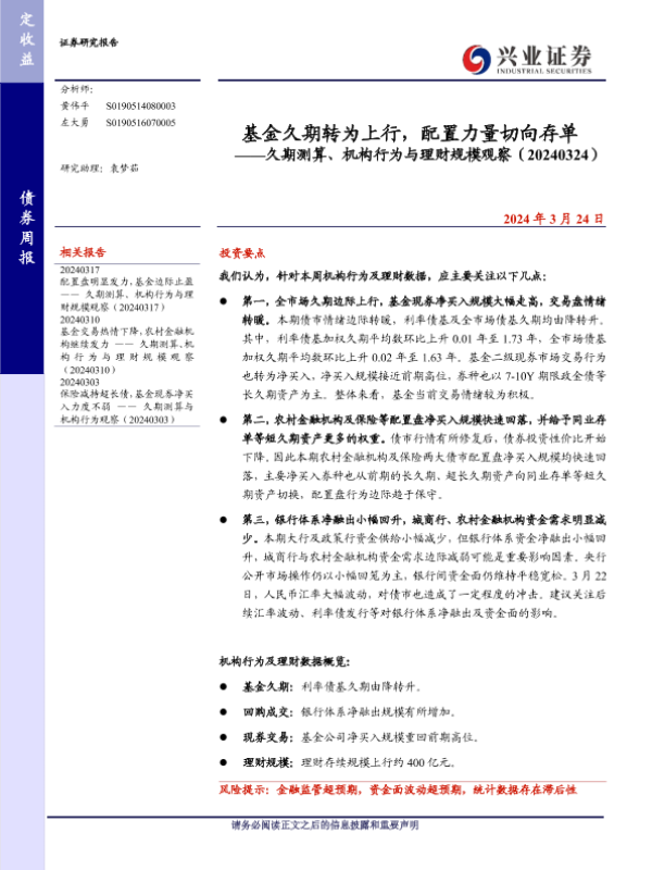 【兴业证券】【20240324】久期测算、机构行为与理财规模观察:基金久期转为上行,配置力量切向存单-13页
