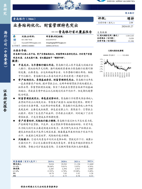 【国泰君安证券】【20240327】青岛银行(3866.HK)首次覆盖报告:业务结构优化,财富管理特色突出-14页