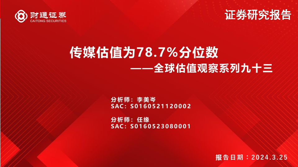 【财通证券】【20240325】全球估值观察系列九十三:传媒估值为78.7%分位数-29页