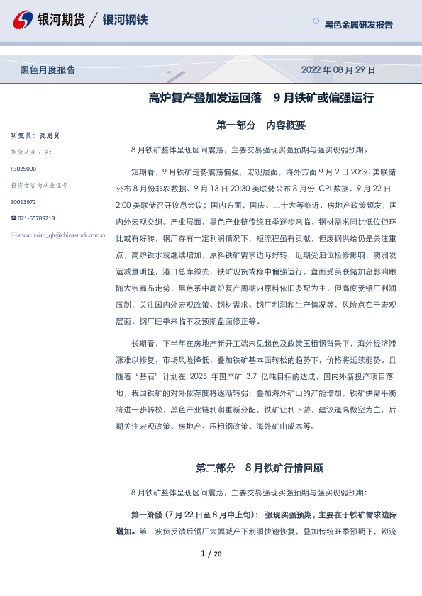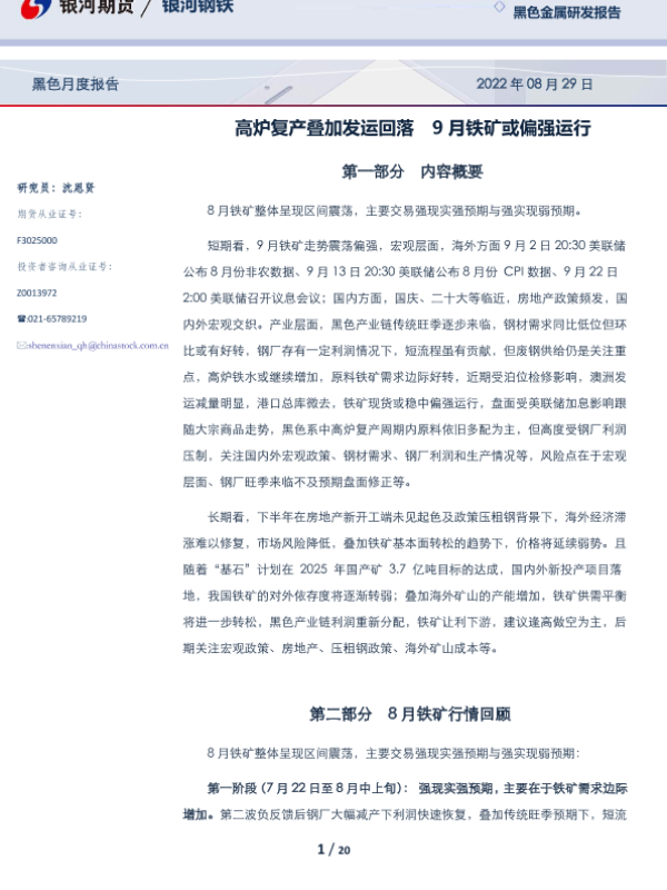 【银河期货】【20220829】黑色月度报告:高炉复产叠加发运回落,9月铁矿或偏强运行-20页