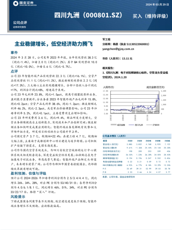 【国金证券】【20240329】四川九洲-000801.SZ-公司点评:主业稳健增长,低空经济助力腾飞-10页
