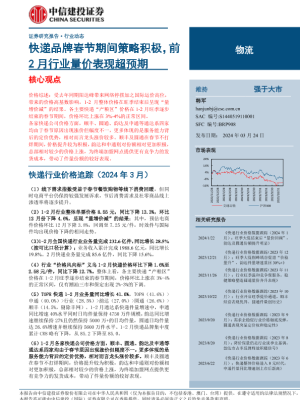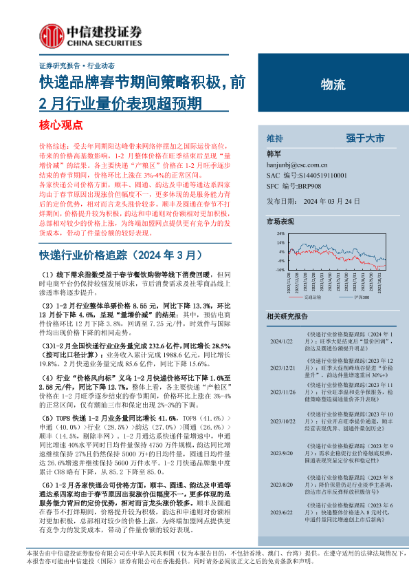 【中信建投证券】【20240324】物流行业:快递品牌春节期间策略积极,前2月行业量价表现超预期-19页