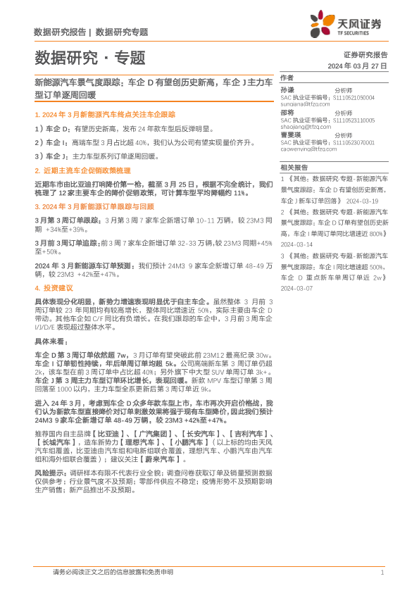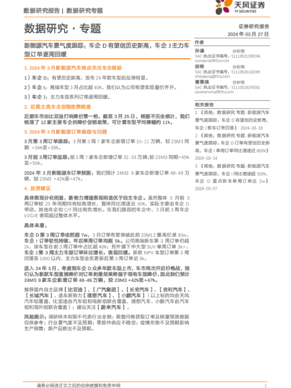 【天风证券】【20240327】新能源汽车行业景气度跟踪:车企D有望创历史新高,车企J主力车型订单逐周回暖-12页
