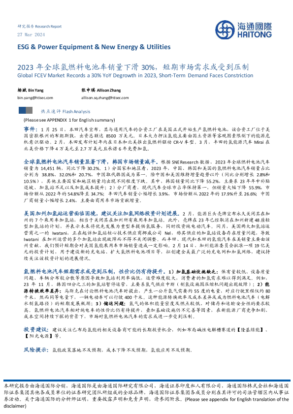 【海通国际】【20240327】2023年全球氢燃料电池车销量下滑30%,短期市场需求或受到压制-10页