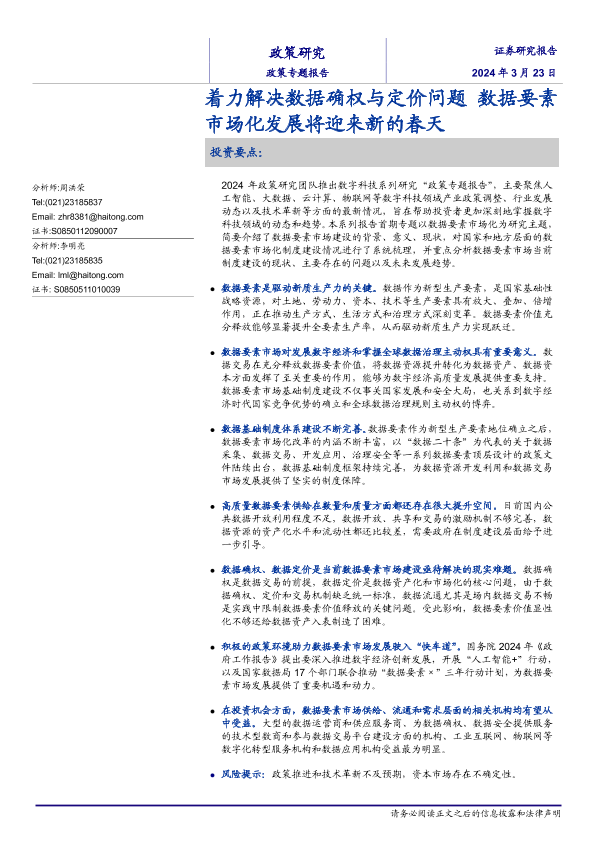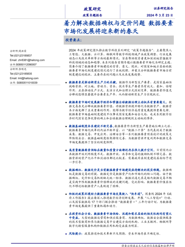【海通证券】【20240323】政策专题报告:着力解决数据确权与定价问题,数据要素市场化发展将迎来新的春天-28页