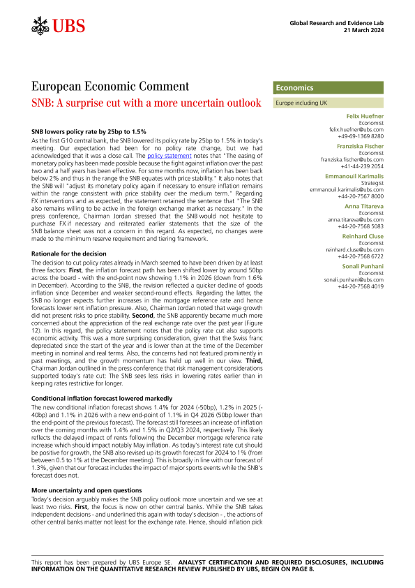 【UBS Europe SE】【20240321】SNB A surprise cut with a more uncertain outlook-13页