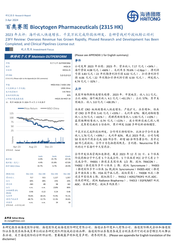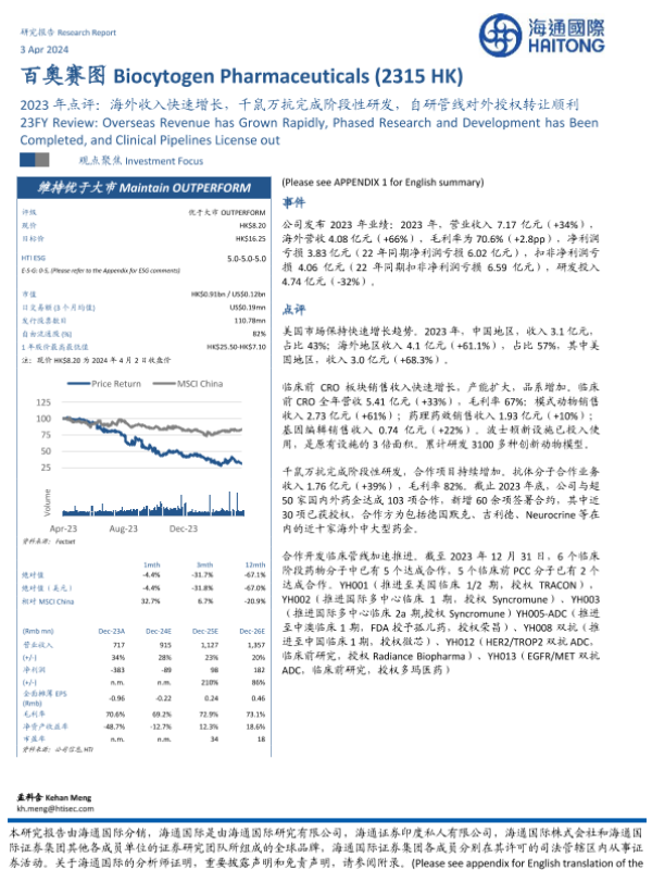 【海通国际】【20240403】百奥赛图-B(2315.HK)2023年点评:海外收入快速增长,千鼠万抗完成阶段性研发,自研管线对外授权转让顺利-14页