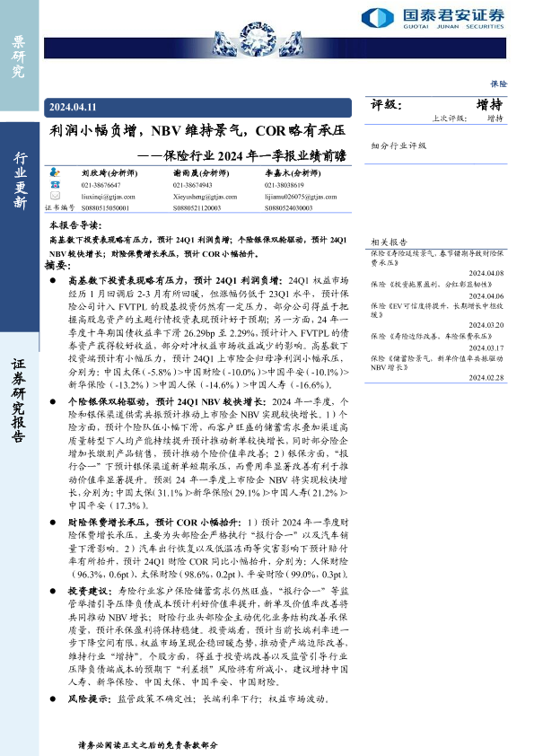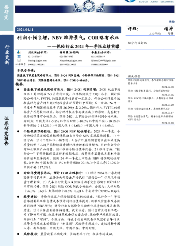 【国泰君安证券】【20240411】保险行业2024年一季报业绩前瞻:利润小幅负增,NBV维持景气,COR略有承压-10页