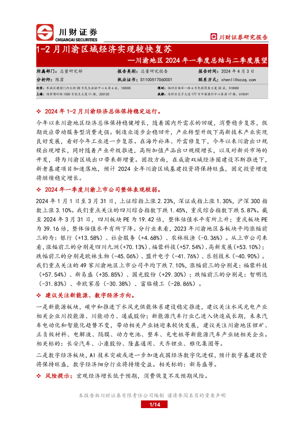 【川财证券】【20240403】川渝地区2024年一季度总结与二季度展望:1-2月川渝区域经济实现较快复苏-14页