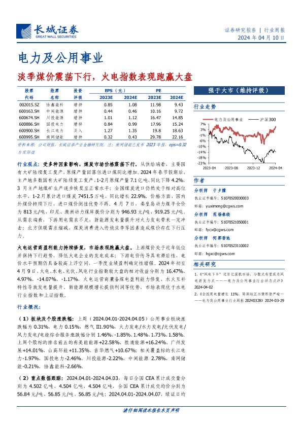 【长城证券】【20240410】电力及公用事业行业:淡季煤价震荡下行,火电指数表现跑赢大盘-11页