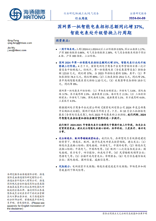 【海通国际】【20240409】电气设备行业:国网第一批智能电表招标总额同比增37%,智能电表处升级替换上行周期-11页