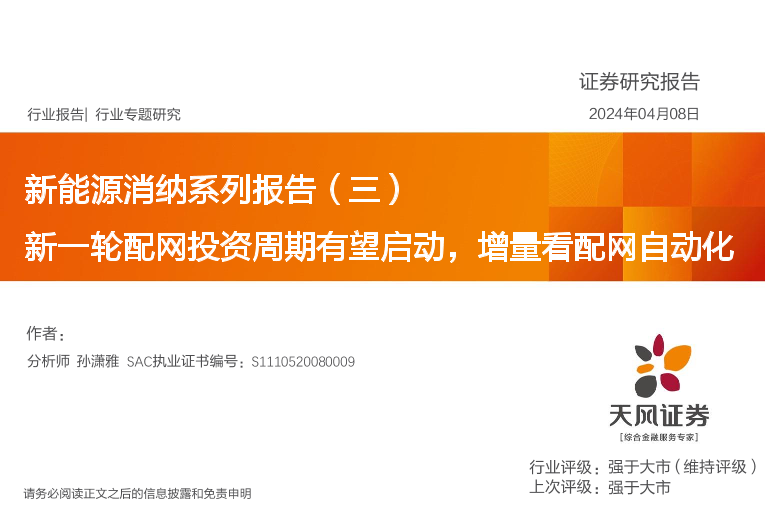 天风证券 新能源消纳 电力设备 自动化 配网投资