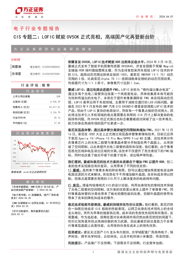 【方正证券】【20240407】电子行业专题报告-CIS专题二:LOFIC赋能OV50K正式亮相,高端国产化再登新台阶-13页