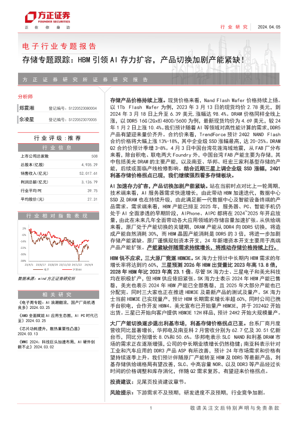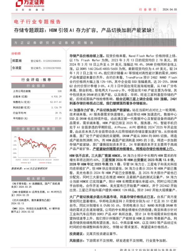 【方正证券】【20240405】电子行业专题报告-存储专题跟踪:HBM引领AI存力扩容,产品切换加剧产能紧缺!-26页