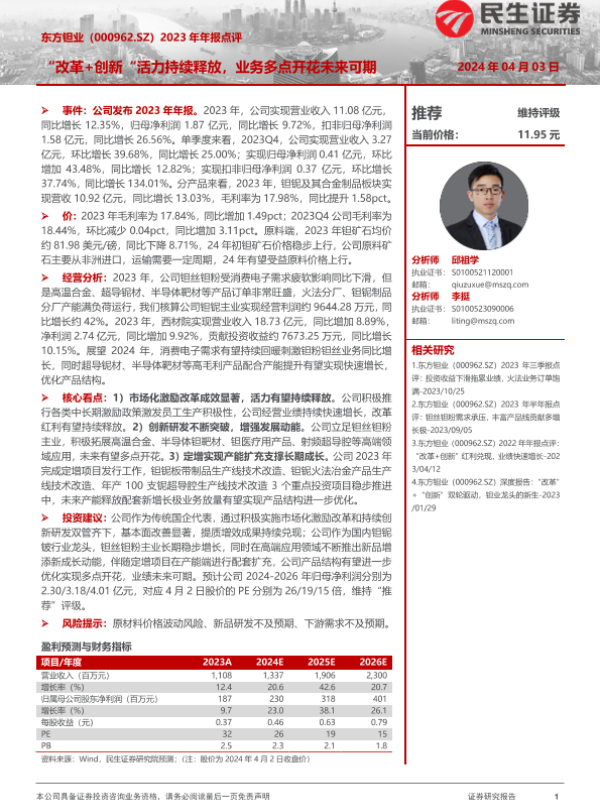 【民生证券】【20240403】东方钽业-000962.SZ-2023年年报点评:“改革+创新”活力持续释放,业务多点开花未来可期-14页