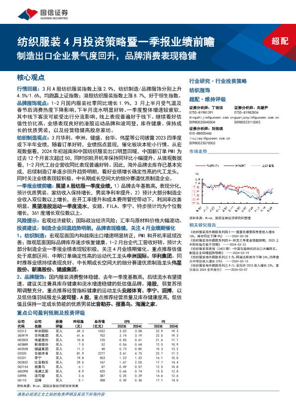 【国信证券】【20240403】纺织服装行业4月投资策略暨一季报业绩前瞻:制造出口企业景气度回升,品牌消费表现稳健-25页