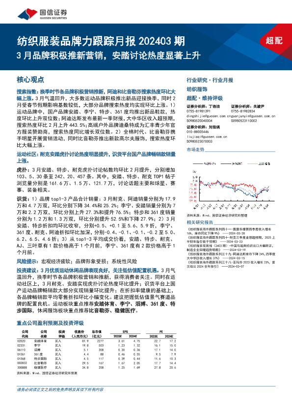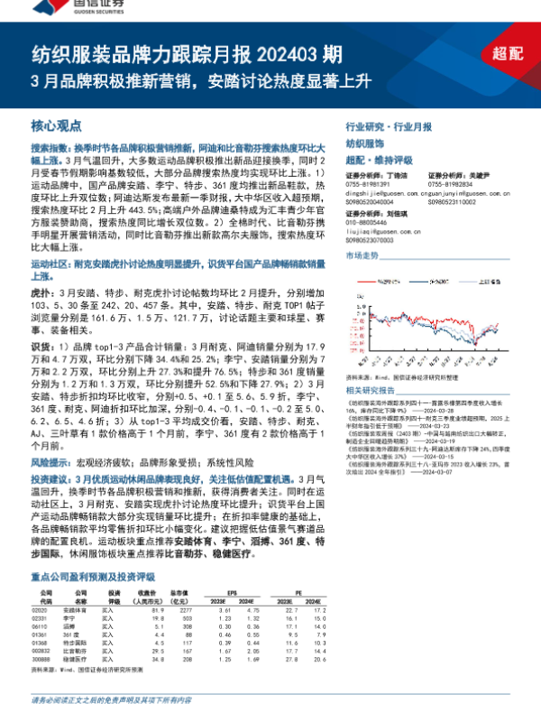 【国信证券】【20240403】纺织服装行业品牌力跟踪月报202403期:3月品牌积极推新营销,安踏讨论热度显著上升-18页